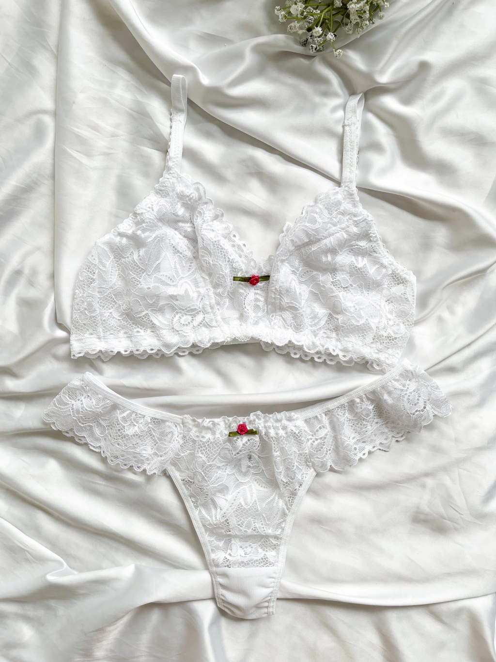 Corpiño sin aro de puntilla escote en V, forrado, con detalle de puntilla en el frente, taza profunda y breteles anchos desmontables.